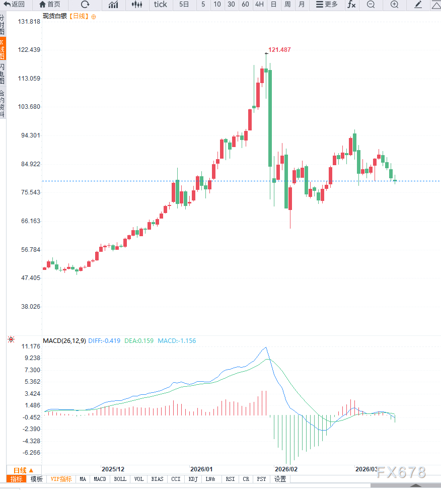 汇通财经APP讯——周一亚洲交易时段,白银市场延续调整走势。现货白银(XAG/USD)在盘中下跌约0.8%,价格回落至约79.80美元附近,并在日内一度测试78美元附近的三周低点。在美联储利率决议公布前,市场整体情绪偏谨慎,投资者正在重新评估利率前景以及能源价格上涨对通胀预期的影响。