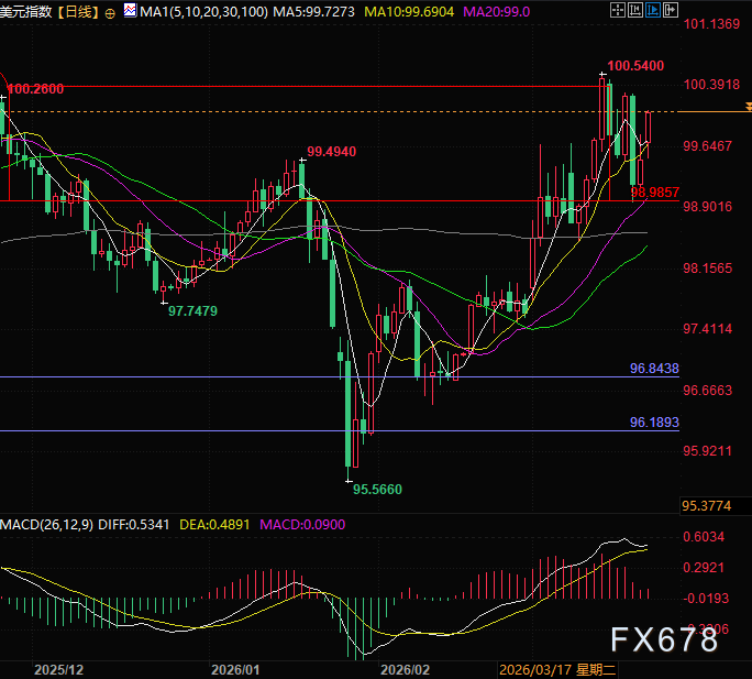 汇通财经APP讯——周一欧洲时段初,美元指数维持强势运行,当前交投于99.65附近。在地缘风险升温及政策预期转鹰的双重驱动下,美元整体表现出较强韧性,市场避险情绪明显升温。 src=http://ca...