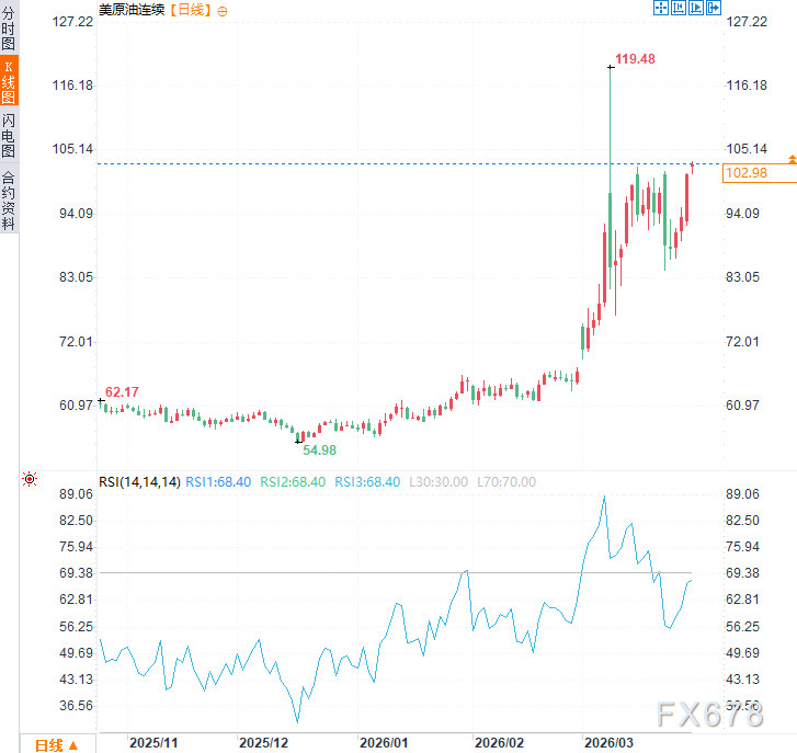 周一(3月30日)亚市时段,美原油价格震荡上行,现交投于每桶102.58美元附近,对比前一交易日结算价,日内涨幅约3%。