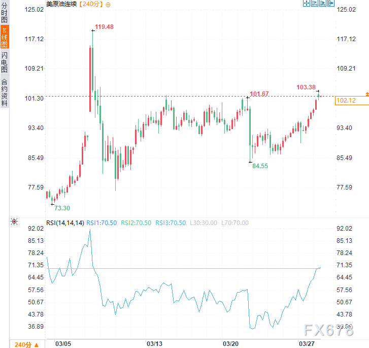 周一(3月30日)亚市时段,美原油价格震荡上行,现交投于每桶102.90美元附近,对比前一交易日结算价,日内涨幅约3.2%。