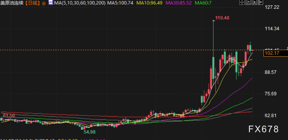 油价周二冲高回落,美原油一度触及3月9日以来新高至106.86美元/桶,布伦特6月原油期货结算价下跌逾3美元,因未经证实的媒体报道称伊朗总统表示已准备好结束战争,但需获得相关保障,6月布伦特原油期货收跌3.42美元报每桶103.97美元;不过布伦特5月合约在到期日上涨4.94%至118.35美元,该合约3月创下64%的月度涨幅纪录,美原油3月涨幅约52%为2020年5月以来最大。