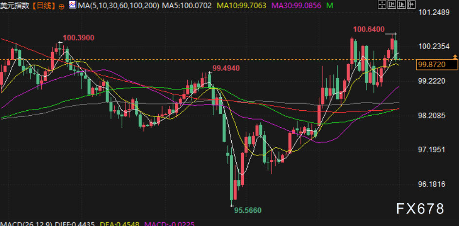美元指数周二下跌0.59%至99.96,因市场寄望美以联军与伊朗的战争可能不会如预期般持久,此前有报道称美国总统特朗普表示即使霍尔木兹海峡仍基本关闭也愿结束对伊朗的军事行动。