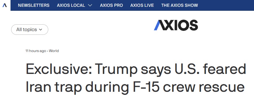 #伊朗危机追踪#FX168财经报社(亚太)讯 美国知名新闻网站Axios周日(4月5日)发布独家报道称,美国总统特朗普(Donald Trump)对Axios表示,美国最初担心,一名被伊朗击落的F-1...