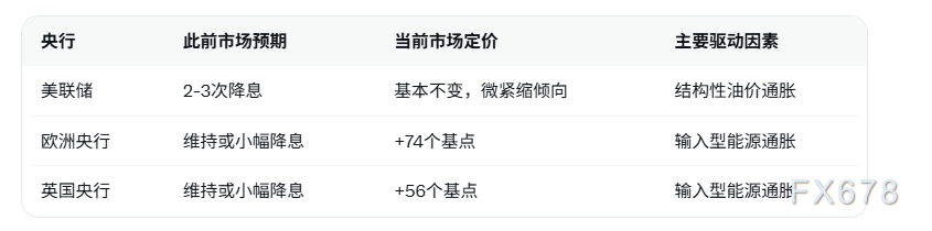 汇通财经APP讯——根据 汇通财经APP 报道,阿布扎比第一银行分析师在最新报告中明确表示,油价的强势已经并将继续(至少在短期内)成为通胀压力更具结构性的驱动因素。分析师指出,通胀压力已导致在央行降息预期消退的情况下利率遭到抛售。此前市场普遍预期美联储今年将降息两到三次,但这些预期已被完全排除。根据金融数据平台LSEG最新显示,货币市场目前预计2026年美国政策利率将基本保持不变,存在非常微小的紧缩倾向。市场甚至已计入欧洲央行和英国央行到今年年底更为鹰派的加息情景,分别加息74个基点和56个基点,“这很大程度上是欧洲输入型能源通胀的结果”。