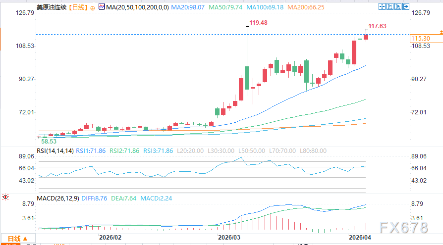 汇通财经APP讯——周二(4月7日)欧盘时段,油价持续攀升,美国西德克萨斯中质原油(WTI)有望连续第四个交易日创下2022年6月以来的最高收盘价。此前,美国总统特朗普向伊朗下达最后通牒,要求其在周二结束前开放霍尔木兹海峡,否则将打击伊朗发电厂及其他基础设施。但伊朗方面并未展现出接受最后通牒的迹象,地区冲突持续升级。