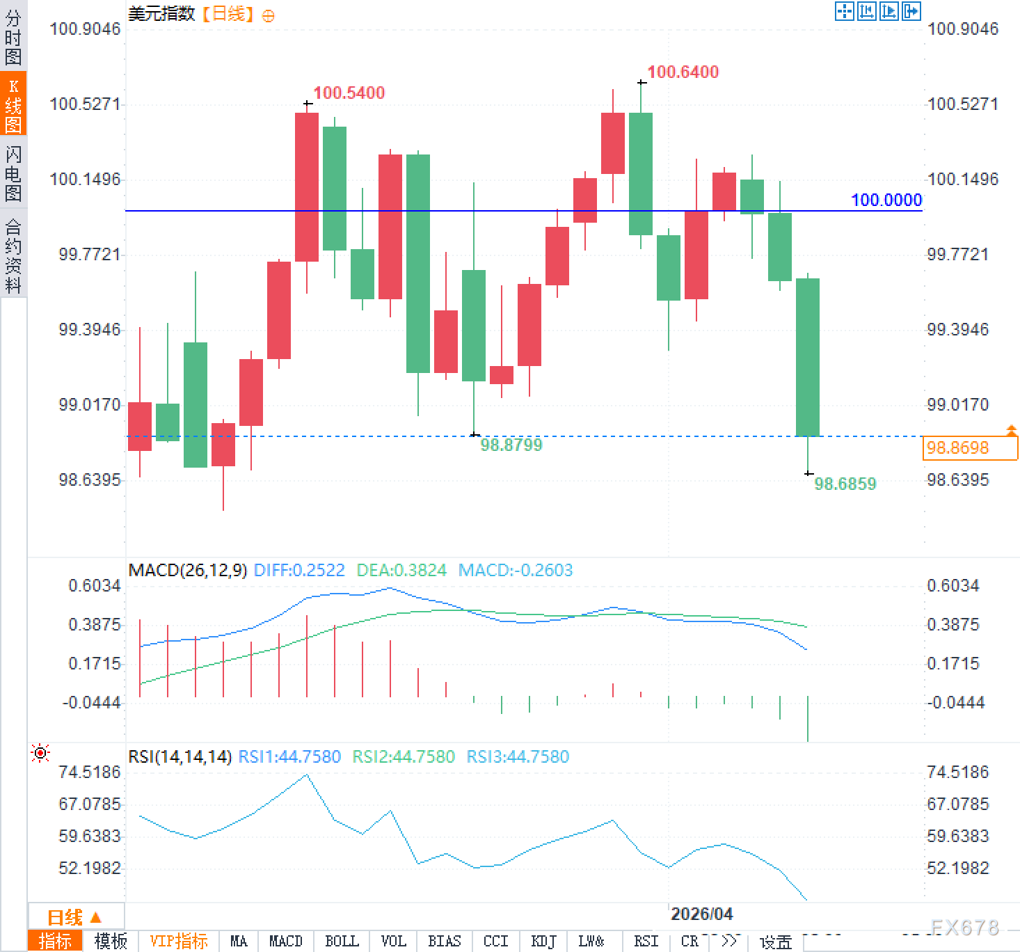 汇通财经APP讯——4月8日周三,随着美伊达成临时停火协议的消息迅速传播,全球金融市场出现显著调整。美元指数目前交投98.85附近,较前一交易日收盘下跌约0.81%。与此同时,风险资产集体反弹,原油期货主力合约大幅回落,WTI原油跌至96.15美元/桶,单日跌幅达到16%,布伦特原油报94.00美元/桶左右,跌幅约10%。