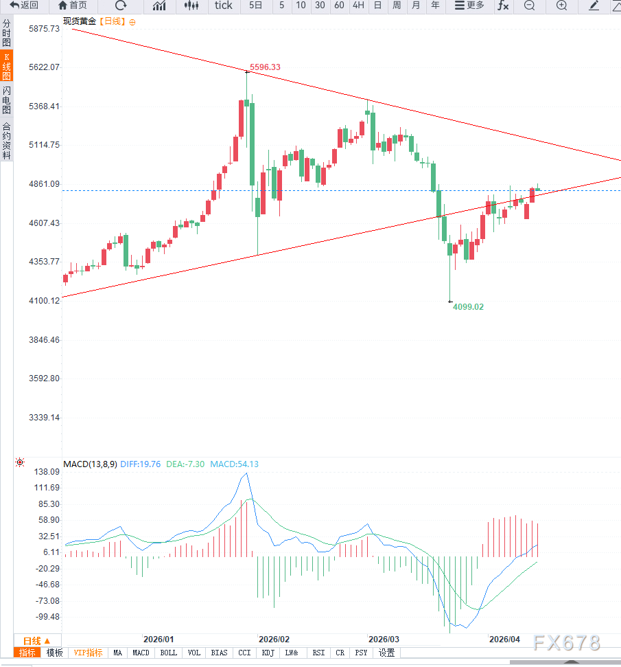 汇通财经APP讯——现货黄金在周三亚洲交易时段触及近四周高点后进入整理阶段,价格运行在4850美元下方,整体涨势有所放缓。尽管短线缺乏进一步上行动能,但市场整体结构仍偏向多头,主要受美元走弱及利率预期变化的支撑。
