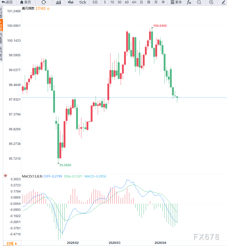 美元指数在周四亚洲交易时段继续承压下行,维持在97.90附近运行,延续自4月6日以来的回落走势。当前美元整体走势偏弱,主要受到市场风险情绪改善以及宏观利率预期变化的双重影响。