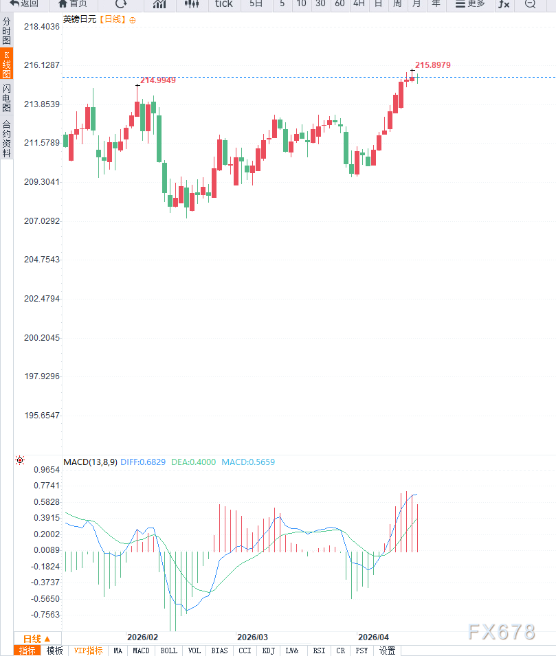 汇通财经APP讯——英镑兑日元在周四欧洲早盘维持高位整理,汇价运行于215.60附近,此前已连续八个交易日上涨,并触及历史高点215.91。尽管涨势暂时放缓,但整体仍处于强势区间,显示多头动能依然占优。