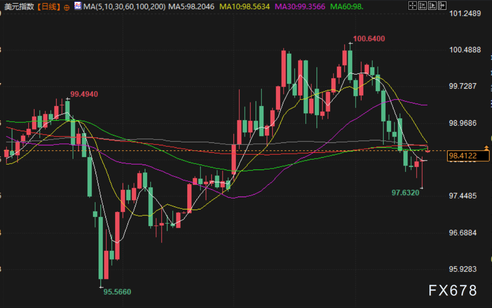 美元指数上周五下跌0.3%至97.96,盘中触及七周低位97.632,连续第二周收跌。伊朗宣布在停火期间对所有商船开放海峡,美伊谈判取得进展,油价暴跌逾10%,美股大涨,美债收益率走低。