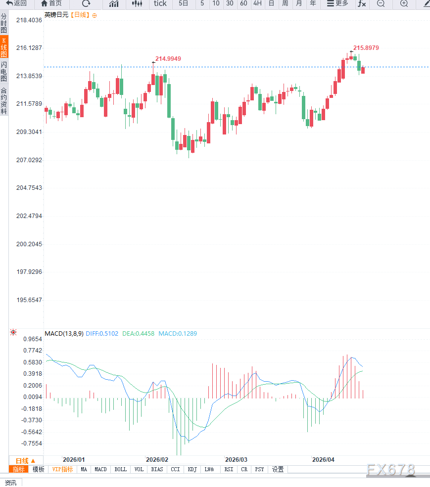 汇通财经APP讯——英镑兑日元在周一欧洲时段延续上涨走势,汇价升至214.60附近,整体表现偏强。从盘面表现来看,日元在主要货币中相对疲软,为汇价提供了主要上行动力。