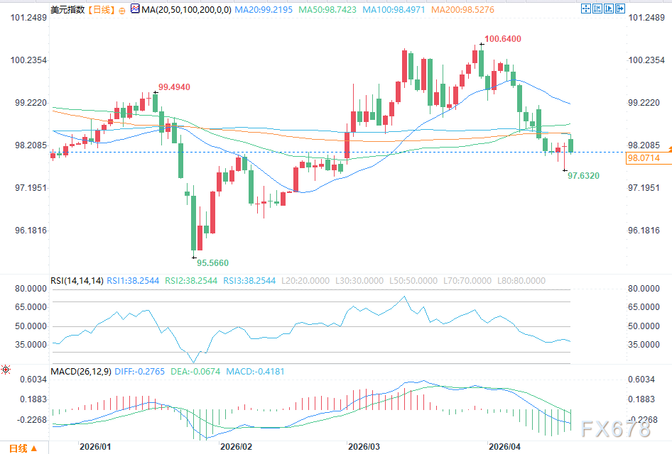 汇通财经APP讯——周一(4月20日)美市盘中,美元指数逐步走低,彻底回吐了早盘全部涨幅。市场开盘表现强劲,承接上周五尾盘的反弹趋势继续上行,但买盘力量在触及98.395点位后快速衰竭,该点位略低于200日均线98.524与50日均线98.732,多重关键技术压力叠加,直接压制了多头的上攻节奏。
