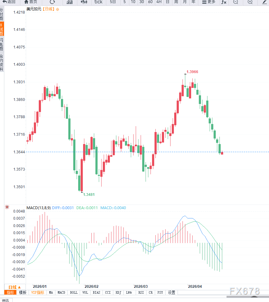 汇通财经APP讯——周二欧洲早盘,美元兑加元(USD/CAD)延续回落走势,当前交投于1.3650附近,整体维持偏弱格局。市场在油价上涨与地缘局势不确定性之间进行权衡,使汇价承压运行。
