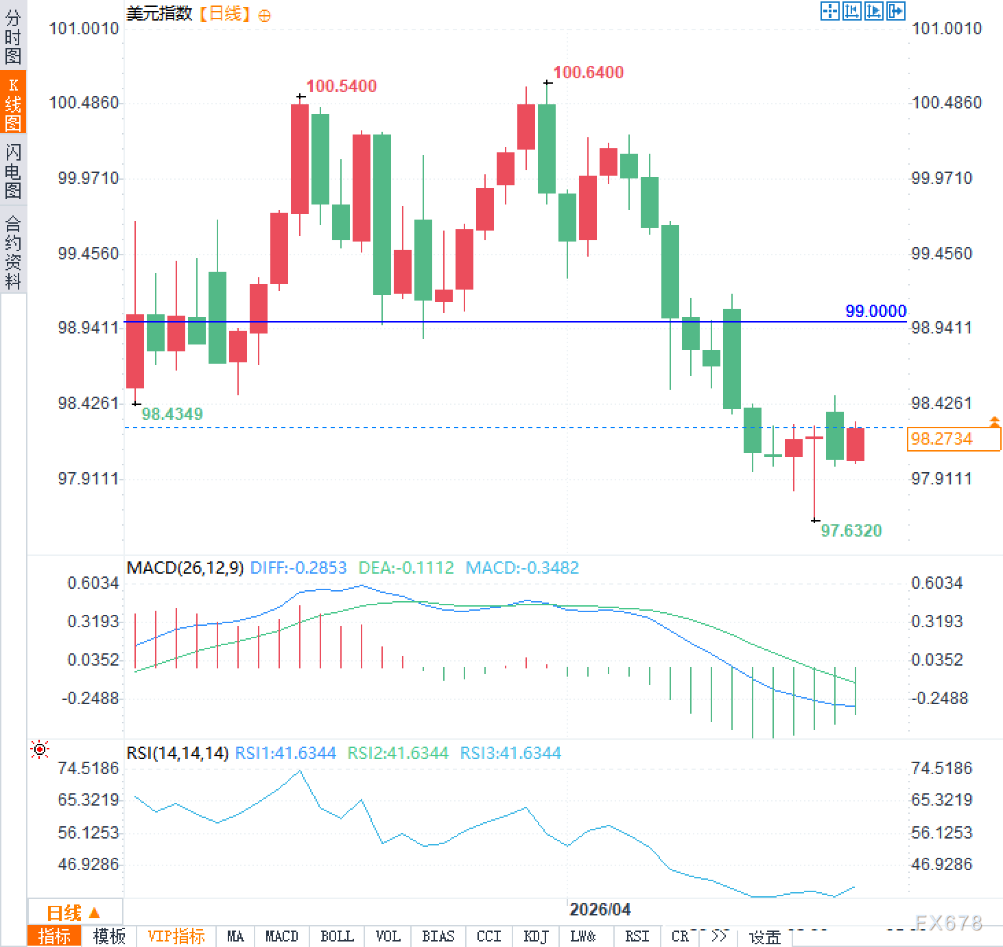 汇通财经APP讯——周二(4月21日)亚欧时段,美元指数盘中快速上涨0.26%,交投于98.26附近。美伊临时停火将于北京时间4月22日8:00到期,距当前仅剩不到16小时;之前市场对中东缓和的乐观预...