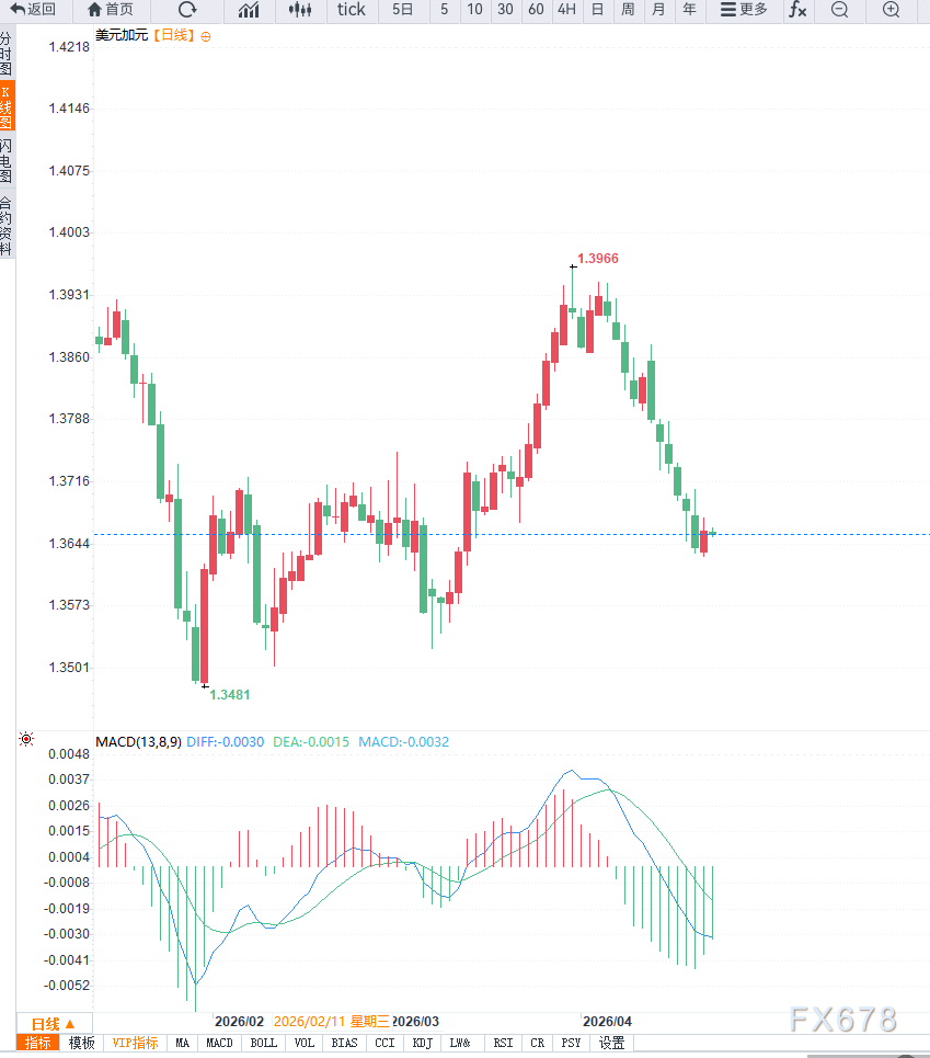 汇通财经APP讯——周三亚洲交易时段,美元兑加元延续回落走势,汇价运行于1.3655附近。从整体表现来看,加元在油价支撑下相对走强,而美元虽受数据支撑但动能有限,导致汇价呈现震荡下行态势。