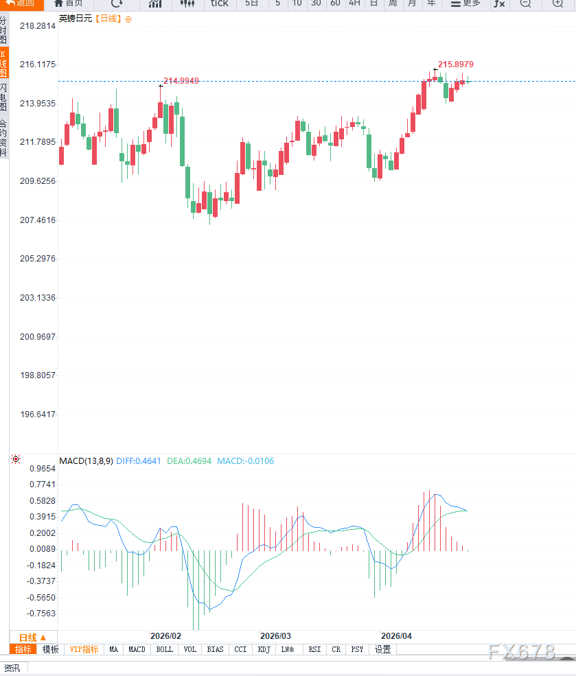 汇通财经APP讯——周四欧洲交易时段,英镑兑日元(GBP/JPY)收复早盘跌幅,小幅转涨至215.45附近。本轮反弹主要源于日元整体走弱,而非英镑显著走强,显示当前行情更多由对手货币驱动。