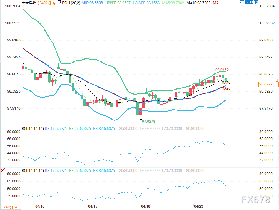 汇通财经APP讯——周五(4月24日)欧盘时段,市场整体交投平淡,美元有望创下三周以来首个单周上涨行情。美伊和平谈判陷入僵局,市场对于中东紧张局势短期内得到缓和的预期大幅降温,这提振了美元的避险需求。北京时间18:42,美元指数报98.7142/9150,跌幅0.12%。