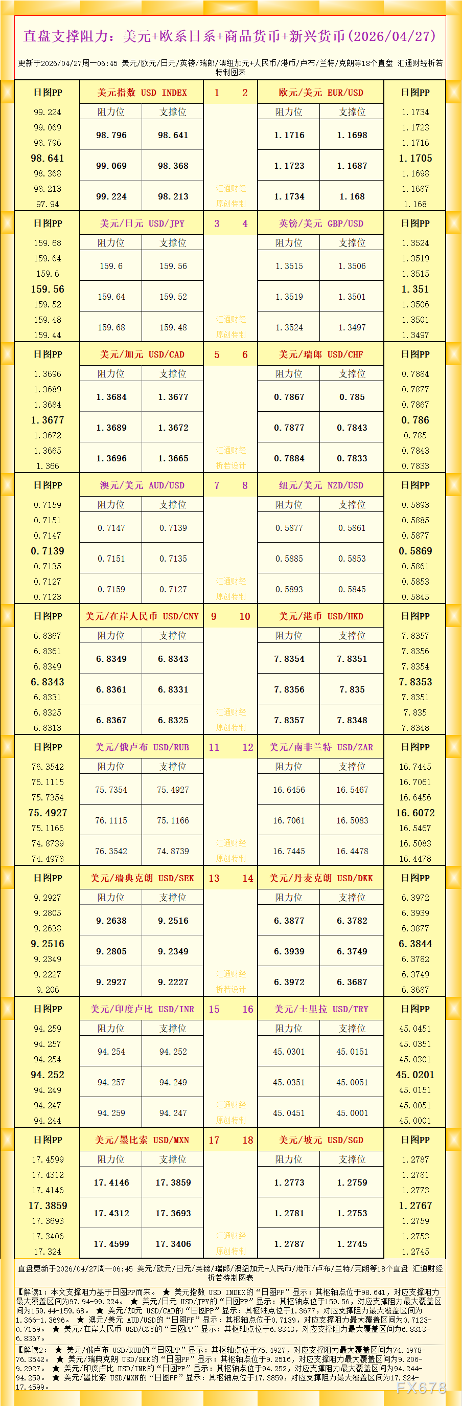 汇通财经APP讯——一张图看直盘支撑阻力:美元+欧系日系+商品货币+新兴货币,更新于2026年4月27日周一06:45,具体美元/欧元/日元/英镑/瑞郎/澳纽加元+人民币/港币/卢布/兰特/克朗等18...
