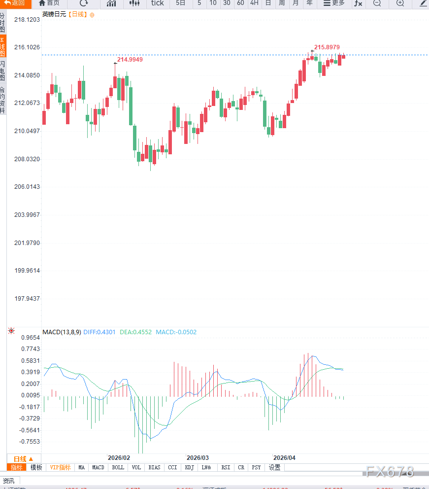 汇通财经APP讯——周一欧洲早盘,英镑兑日元小幅走高至215.70附近,延续短线反弹走势。汇价上涨主要受到日元走弱推动,在当前市场环境下,日元表现明显落后于其他主要货币。