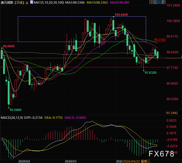 汇通财经APP讯——周一(4月27日)亚欧时段,美元指数全天回调目前跌0.26%,虽然谈判取消但是再次开火的概率依然不大,目前美元指数交投于98.26附近。