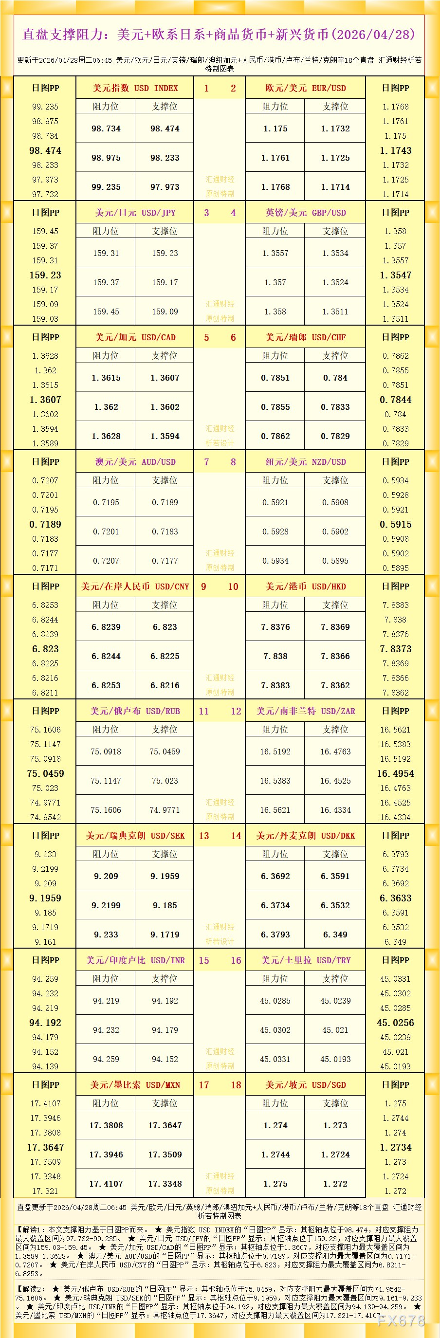 汇通财经APP讯——一张图看直盘支撑阻力:美元+欧系日系+商品货币+新兴货币,更新于2026年4月28日周二06:45,具体美元/欧元/日元/英镑/瑞郎/澳纽加元+人民币/港币/卢布/兰特/克朗等18...