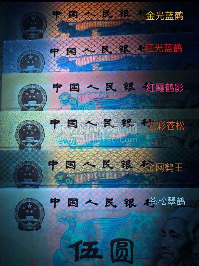 需要提醒的是,第四套人民币5元纸币,还有“苍松翠鹤”“金光蓝鹤“、“红光蓝鹤”“红霞鹤影”、“五彩苍松”、“金网鹤王”等荧光品种,市场价位要比普通品种高出许多,值得藏友关注。