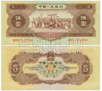 红五元为二版币中的伍元纸币,正面图案都是各族人民大团结,预示着1953年建国初期中国人民团结友爱,国家欣欣向荣的美好愿望,制作工艺也非常的精致细腻。