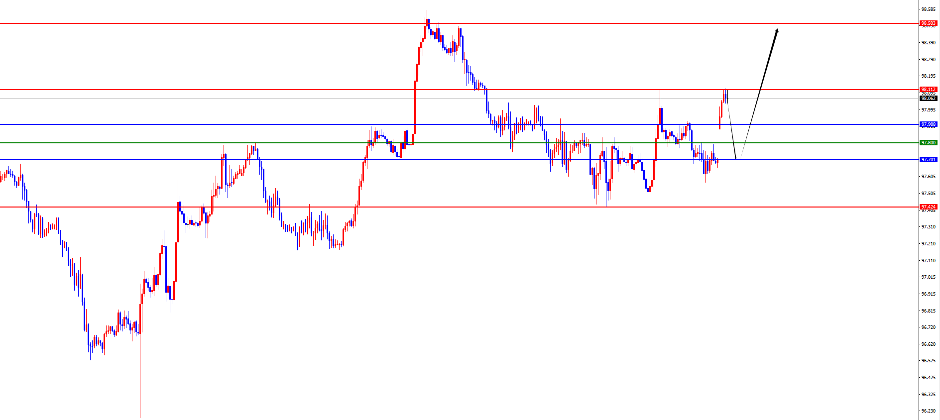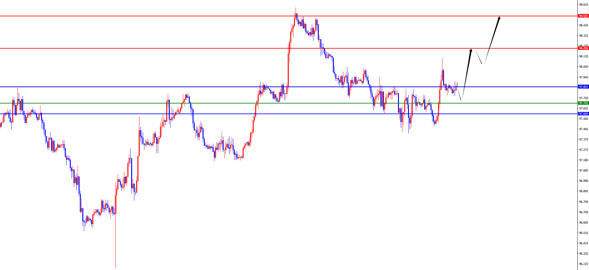 从多周期分析,周线级别来看近期价格在周线关键上下盘整,目前周线支撑于97.90区域,后续持续关注价格周线收盘在此位置上方,一旦收盘在此位置上方则后续将发力上涨。从日线级别看,随着时间的推移目前日线支撑于97.70区域,价格此位置之上波段进一步上涨。从四小时上看,在上周初价格承压于四小时阻力位置,在上周四价格突破上涨,之后周五再度回踩至日线及四小时支撑,整体目前四小时支撑于97.80位置。一小时上今日早盘直接跳空高开,后续待价格回补缺口后继续看多头延续。