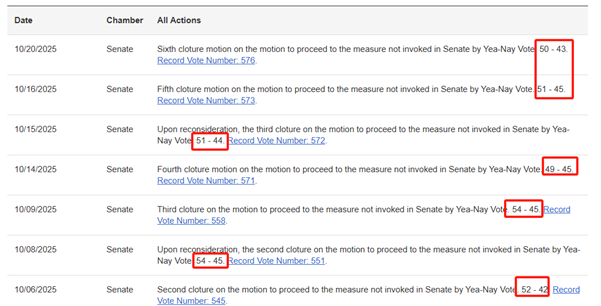 ATFX汇评:10月20日,美国参议院对紧急拨款法案举行最新一轮投票。结果显示,50票赞成,43票反对。虽然赞成票高于反对票,但由于参议院规定,赞成票达到60票才能宣布法案通过。所以,特朗普团队结束白宫停摆的努力再次宣告失败。