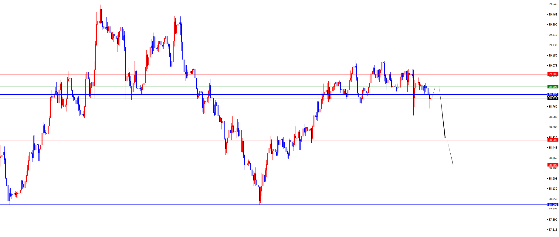 从多周期分析,周线价格经过前期持续震荡但是整体受撑于周线关键位置,目前周线支撑于98区域,后续关注进一步中期多头(需要注意缺口位置)。从日线级别看,随着时间的推移目前日线阻力于98.85区域,此位置是波段走势的关键,短线价格进行刺破,后续关注能否实际收盘在此位置下方是关键,一旦下破则关注后续波段的承压。四小时级别看,上周五价格在四小时关键位置上下盘整,同时刺破日线支撑,价格目前有进一步下探的表现,所以重点关注上方98.90-99区间阻力承压,下方短线关注98.50-98.30区域。
