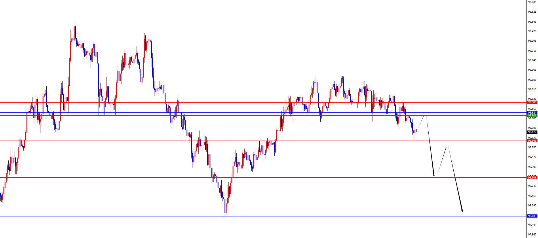 从多周期分析,周线价格经过前期持续震荡但是整体受撑于周线关键位置,目前周线支撑于98区域,后续关注进一步中期多头(需要注意缺口位置)。从日线级别看,随着时间的推移目前日线阻力于98.80区域,此位置是波段走势的关键,目前价格已经进行下破,后续关注此区域持续承压。四小时级别看,昨日价格持续承压于四小时阻力位置,随着时间的推移目前四小时阻力于98.70-80区间阻力,后续关注此区域继续承压即可。