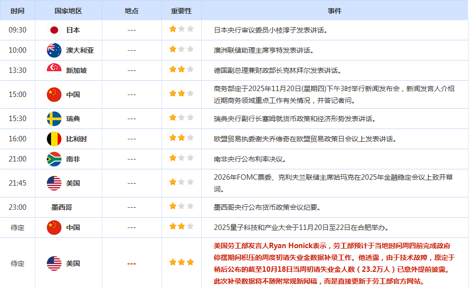 市场目光聚焦于周四将公布的因政府停摆而推迟的9月非农就业报告。分析师指出:"会议纪要已成过去,现在更重要的是看12月会发生什么,美联储还需要更多数据来作决定。"与此同时,美国劳工统计局确认受政府停摆影响,将不会发布10月份就业报告。