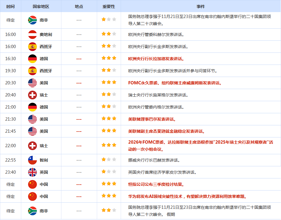 克利夫兰联储主席哈玛克重申反对进一步降息的立场,警告降息可能加剧金融稳定风险。与此同时,日本政府正准备推出规模超过20万亿日元的全面经济刺激计划,预计首相高市早苗将于周五公布。