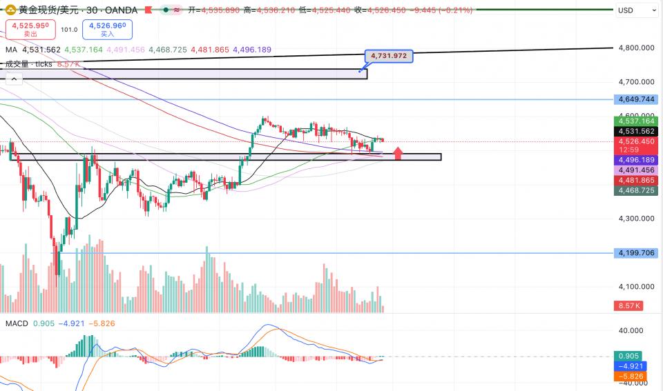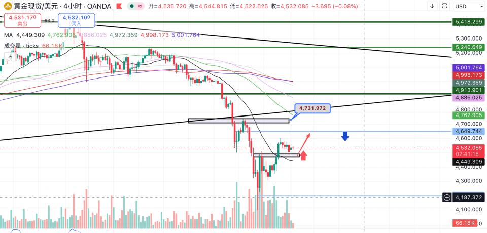 黄金在周三美市尾盘回踩4500–4480支撑区间后止跌企稳,这一位置依旧是当前短线最理想的低多区域。从盘面来看,该支撑的有效性仍在延续。