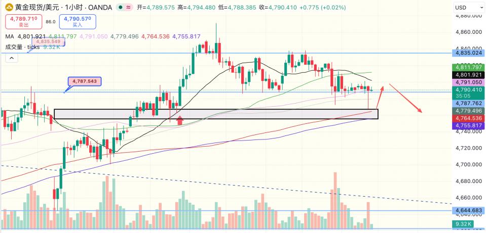 隔夜美盘,黄金如预期走弱,价格跌破关键支撑4787,一度触及4766附近(1小时MA120)。不过尾盘出现反弹,重新回到4787上方,最终收于4790一线。
