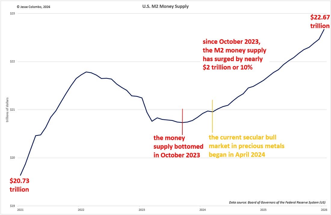 更关键的是:M2货币供应量恰好在当前黄金长期牛市启动前约6个月触底,这绝非巧合。
